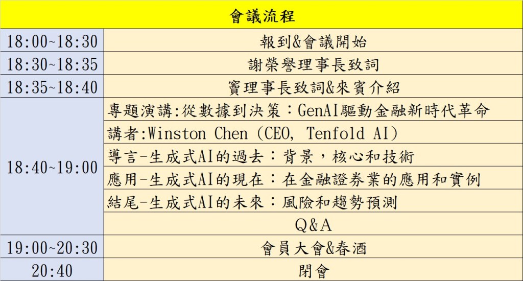 未分類本會第4屆第2次會員大會圓滿成功 臺灣金融工程師暨操盤手協會 第四屆第2次會員大會暨理監事會議 2025.3.12 於台北天成飯店1樓天悅廳舉辦 (台北市中正區忠孝西路一段43號) 2025/3/12 臺灣金融工程師暨操盤手協會 會議流程 本會創會理事長 謝夢龍先生(前中華民國期貨業商業同業公會秘書長)致詞 本會第3屆理事長 韓傳祥先生(清華大學計量財務金融學系副教授)致詞 專題演講:從數據到決策:GenAI驅動金融新時代革命講者:陳奕廷 先生 Winston Chen (CEO, Tenfold AI)導言-生成式AI的過去:背景,核心和技術應用-生成式AI的現在:在金融證券業的應用和實例結尾-生成式AI的未來:風險和趨勢預測 專題演講講師 Winston Chen (CEO, Tenfold AI) 感謝本會創會理事長謝夢龍老師、第3屆理事長韓傳祥老師指導本會辦理金融AI發展計畫及課程,預祝會員事業順利、本次會員大會圓滿成功。